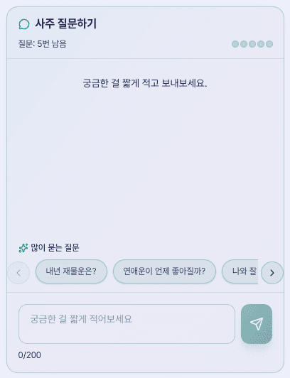 '내년 재물운은?', '연애운 언제 좋아질까?' 결과 본 뒤에도 5번까지 질문 가능.